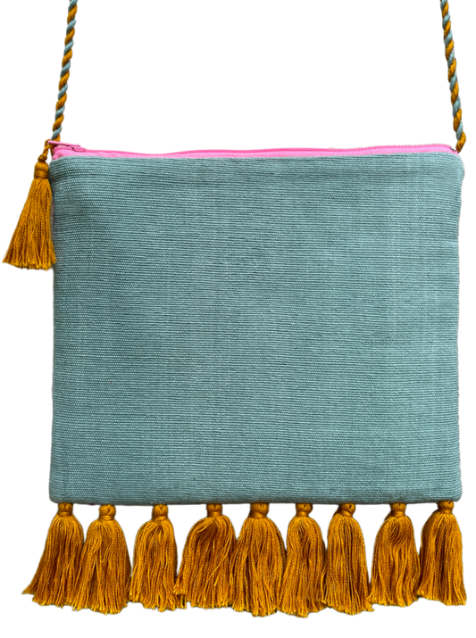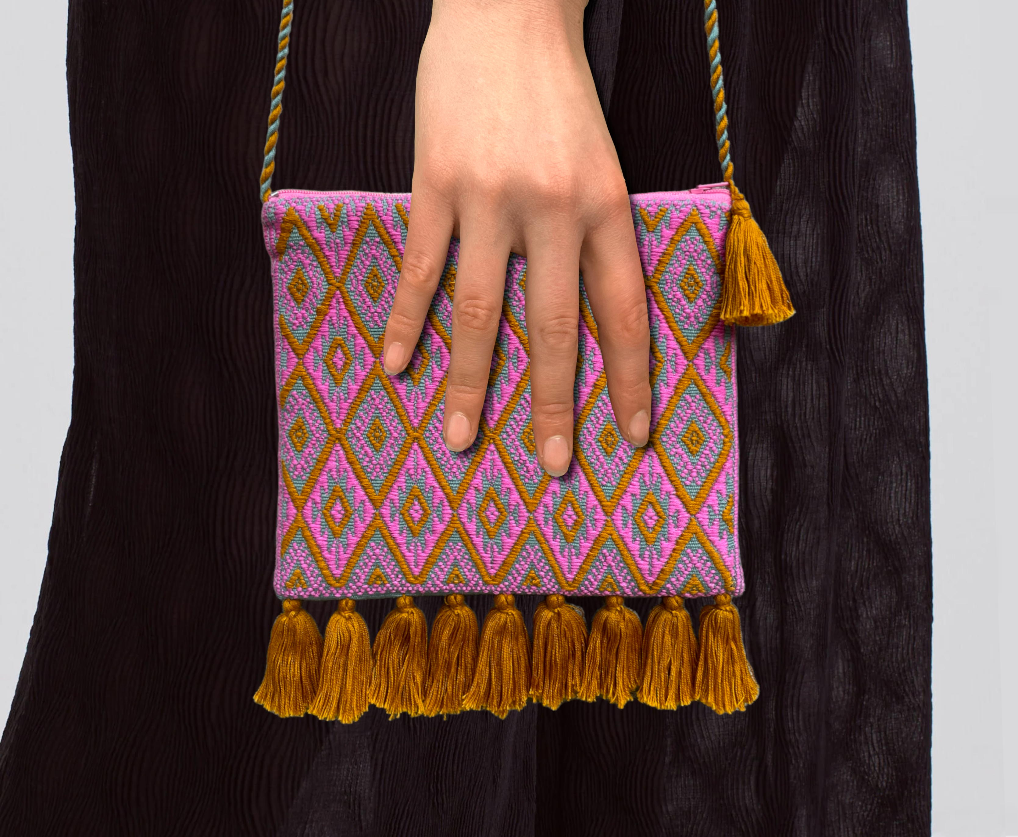 Tissées au telar, ces pochettes en coton, aux formes géométriques, ajoutent une touche colorée à vos tenues.
