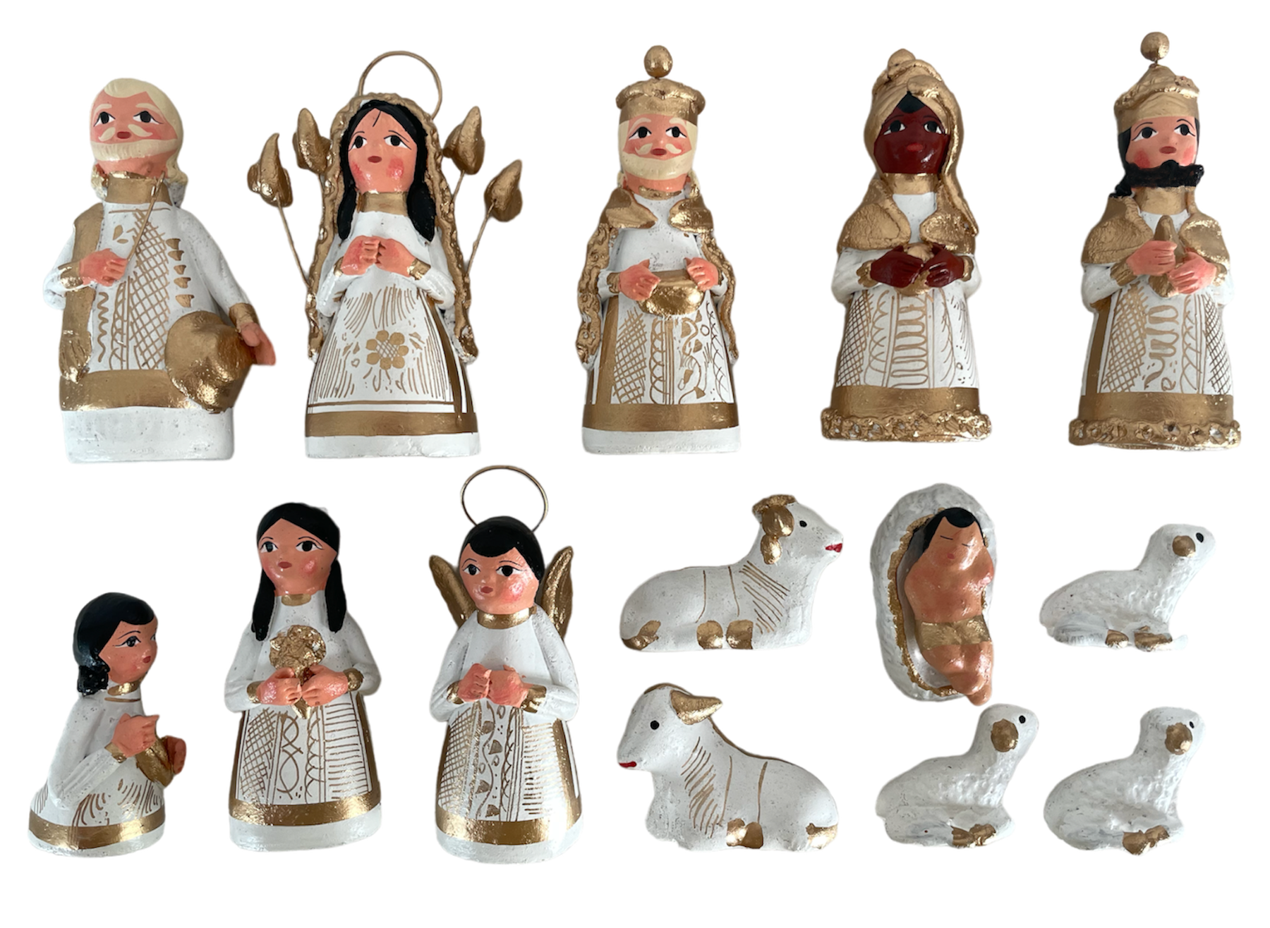 Crèche moyenne 14 santons, blanche et dorée (11 cm).