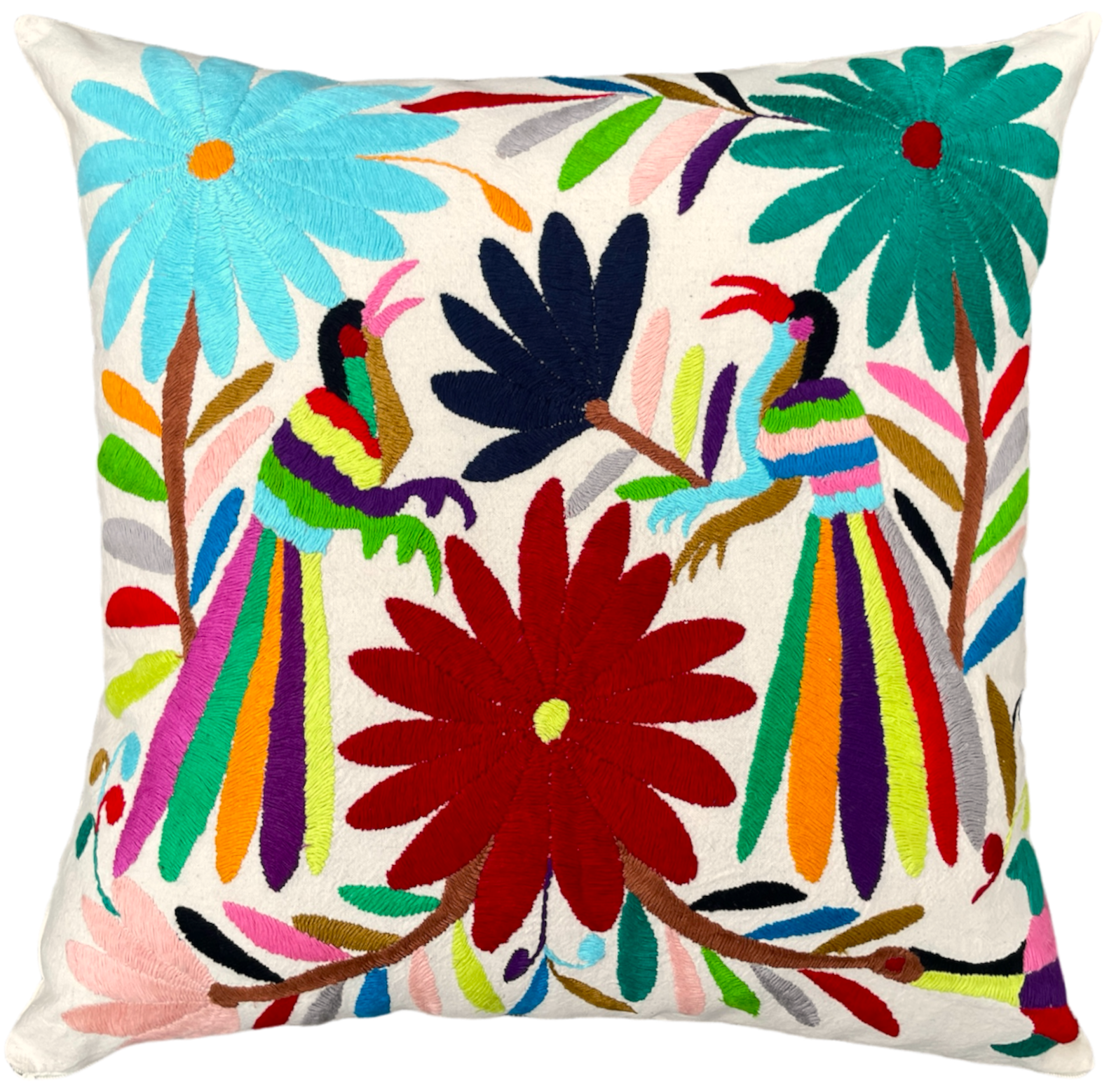 Coussin en coton, dessinée et brodée à la main par la communauté Otomi au Mexique.