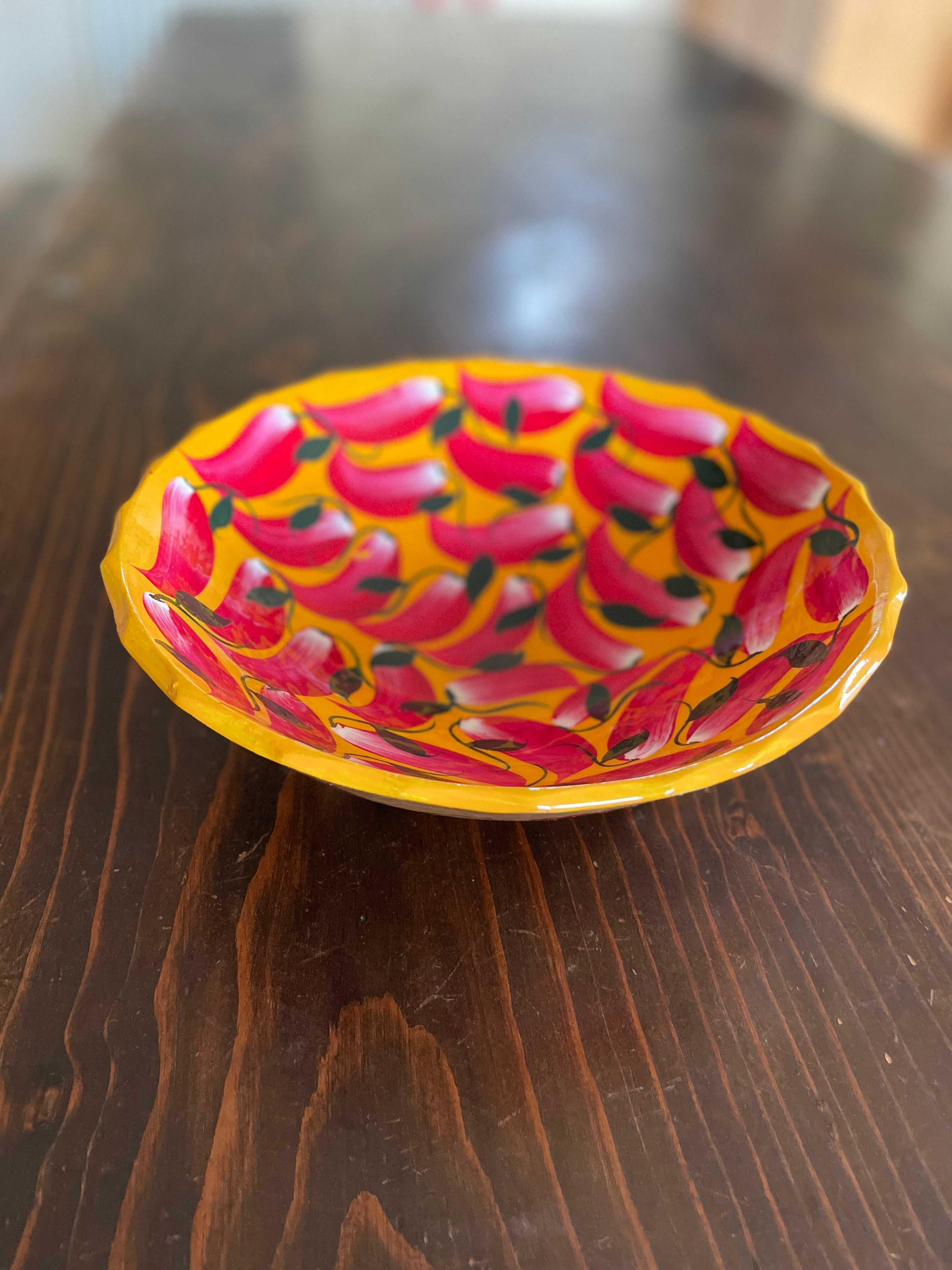 Apportez de la couleur à votre déco avec nos plats en terre cuite, peints à la main avec des motifs de piments. Idéals pour les fruits, légumes, ou simplement comme décoration.