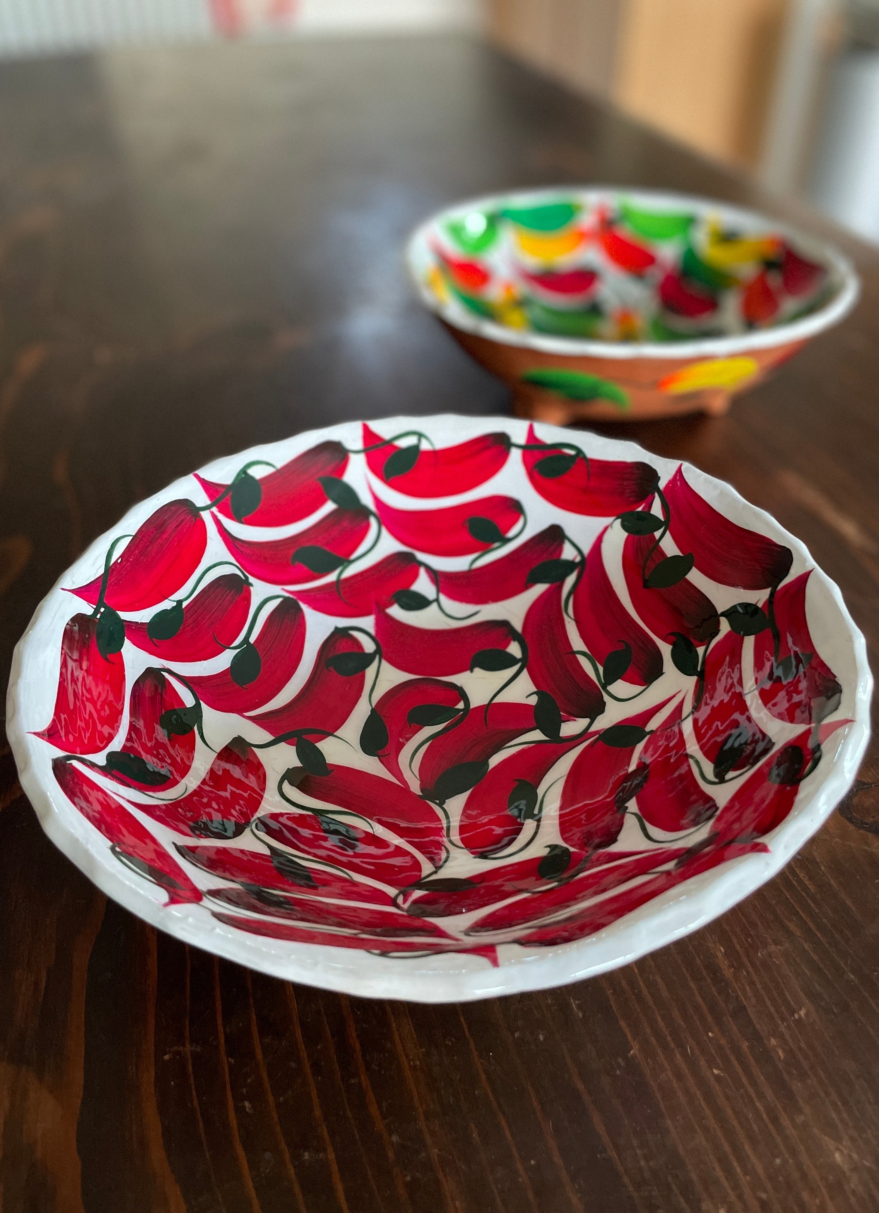 Plat creux , le piment, terre cuite 5,2H x 14,7D. Blanc et rouge